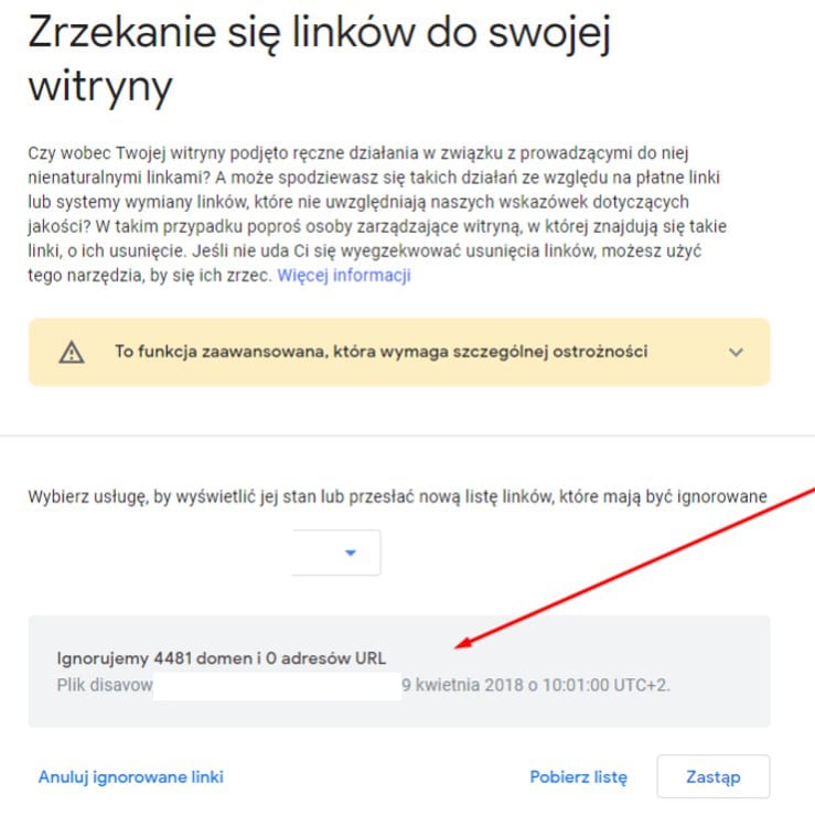Na screenie poniżej przedstawiamy ogólną liczbę domen, która została zgłoszona do Google z użyciem Disavow Tool.