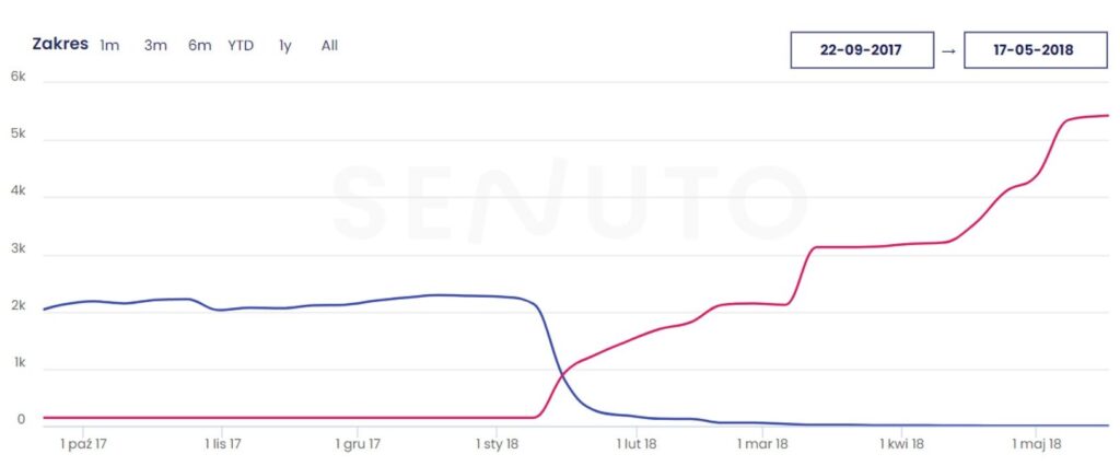 Poniższy wykres przedstawia porównanie widoczności domeny, która miała 88% ruchu organicznego, z domeną docelową po przekierowaniu do niej wszystkich stron.