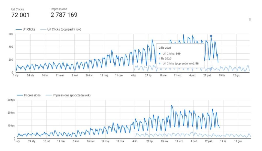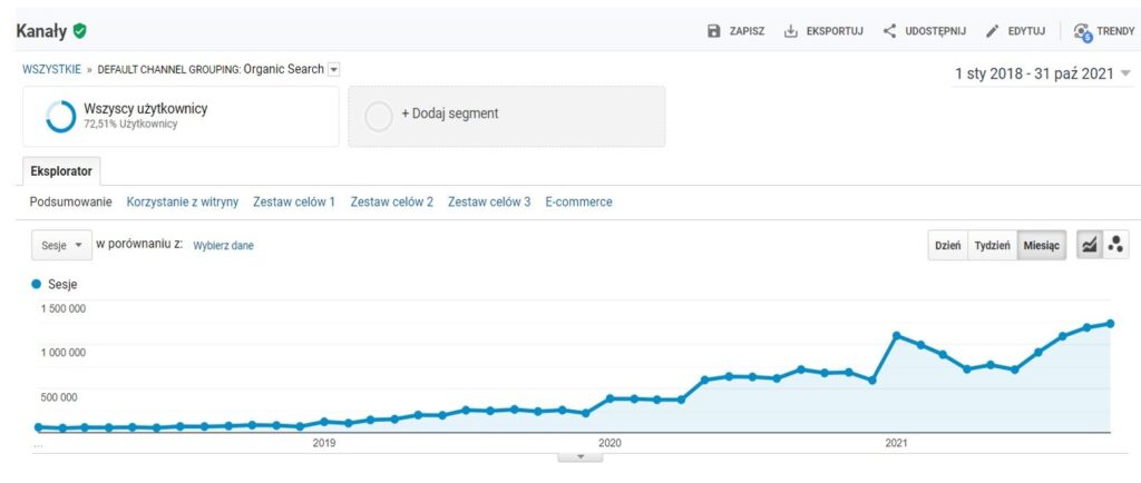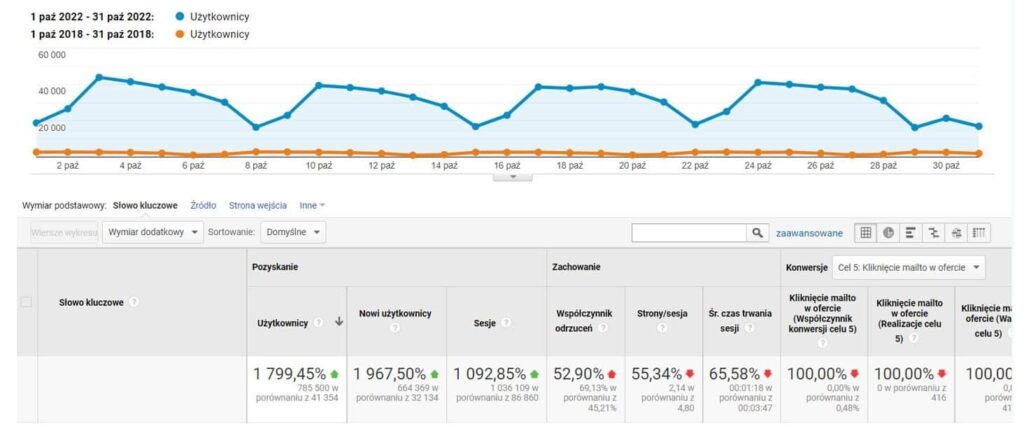 Następny wykres przedstawia ruch Google Analytics – porównanie 10.2018 (pół roku po przekierowaniu wszystkich domen) do 10.2022, podsumowywujące 4 pełne lata pracy nad projektem. Efektem tej pracy był wzrost sesji organicznych z początkowych 86 860 do 1 036 109, czyli o 1092,85% w okresie 4 lat.