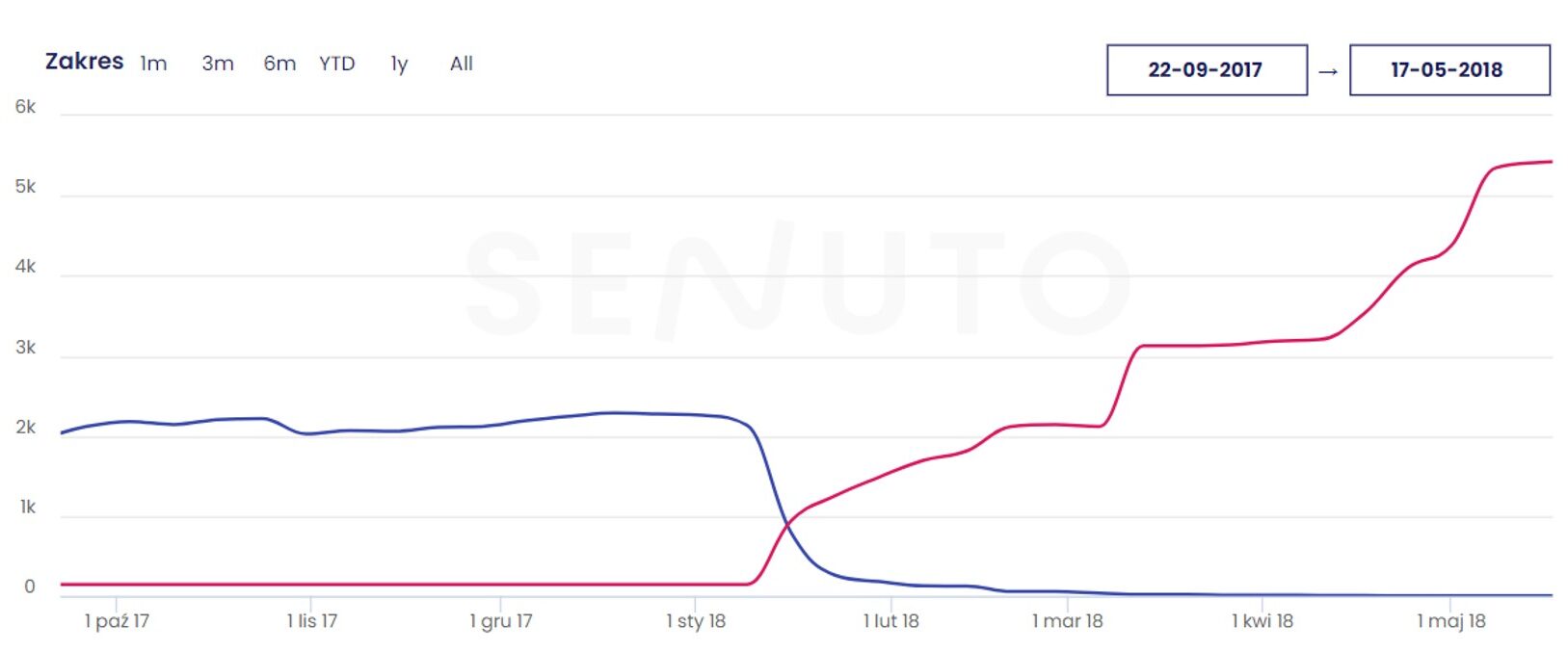 Okazało się, że przygotowana strategia i wykonywanie poszczególnych zadań w odpowiedniej kolejności pozwoliło zwiększyć widoczność serwisu z 4380 słów kluczowych w TOP 10 według Senuto na ponad 68000 słów kluczowych.