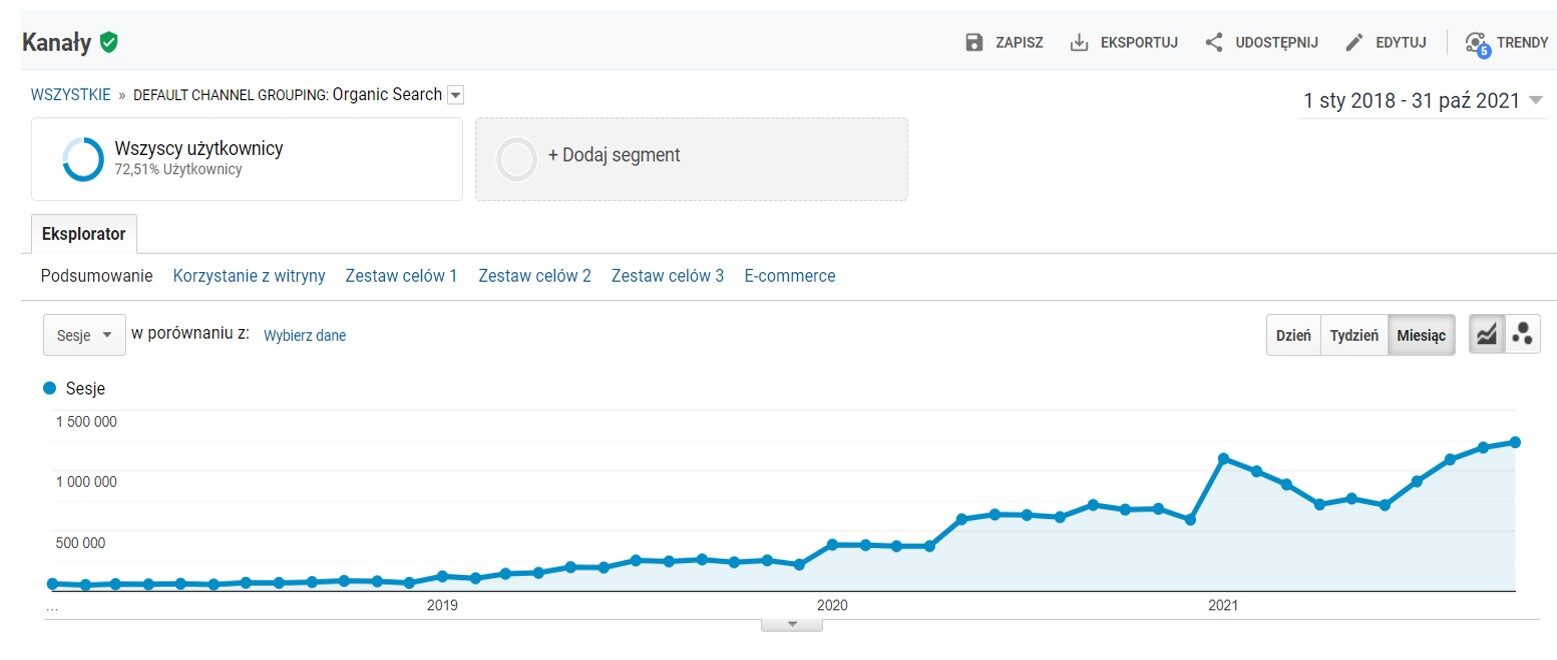 Następny wykres przedstawia ruch Google Analytics – porównanie 10.2018 (pół roku po przekierowaniu wszystkich domen) do 10.2022, podsumowywujące 4 pełne lata pracy nad projektem. Efektem tej pracy był wzrost sesji organicznych z początkowych 86 860 do 1 036 109, czyli o 1092,85% w okresie 4 lat.