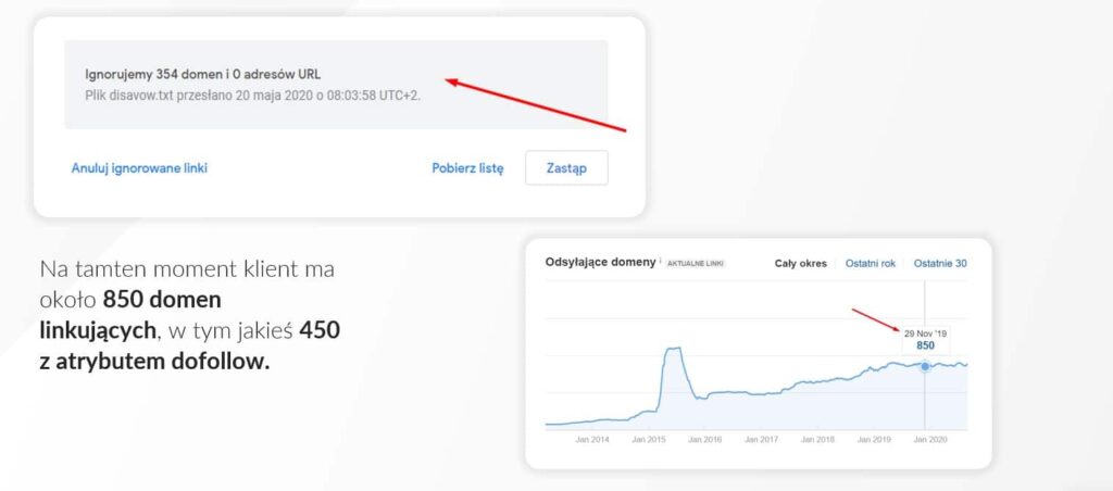 - przygotowanie i zgłoszenie pliku do narzędzia Disavow Tool – dla 354 domen wcześniej linkujących,