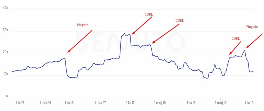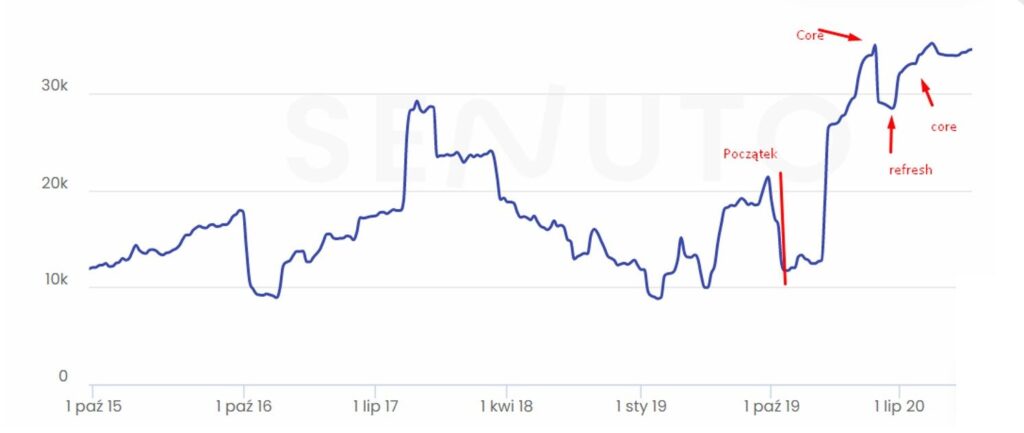 Poniższy wykres przedstawia widoczność w narzędziu Senuto TOP 10 fraz. Jak widzimy, stan początkowy to około 10 000 fraz. Widoczne jest na nim zachowanie serwisu przy kolejnych dużych zmianach algorytmu – obejmujące pierwsze 8 miesięcy działania.