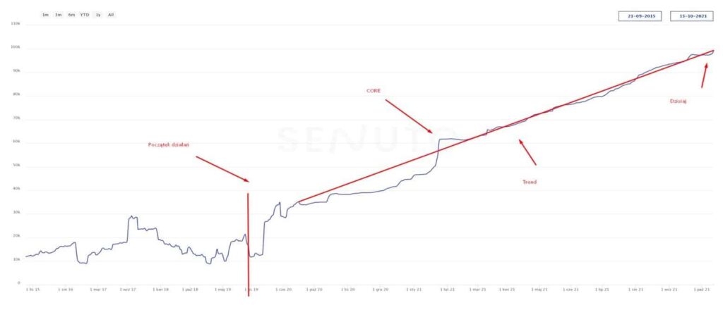 Największym efektem tych działań było ustabilizowanie sytuacji strony w trendzie wzrostowym – szczególnie w momencie występowania poszczególnych dużych zmian algorytmicznym w Google.