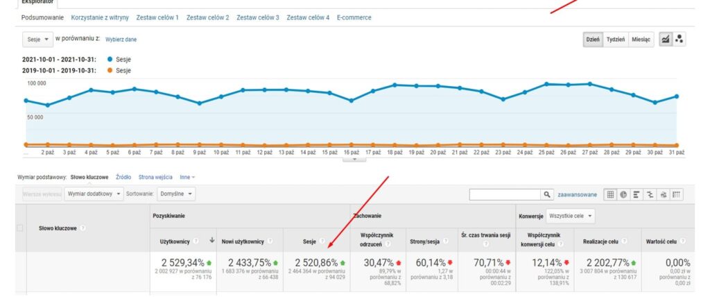 Poniższy wykres przedstawia dane z narzędzia Google Analytics (ruch organiczny), porównanie obejmuje okres 10.2019–10.2021.