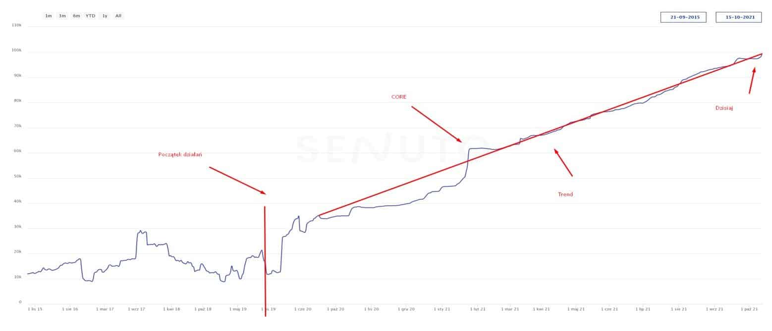 Poniższy wykres przedstawia widoczność serwisu TOP 10 w Senuto w okresie 2 lat współpracy (10.2019–10.2021).