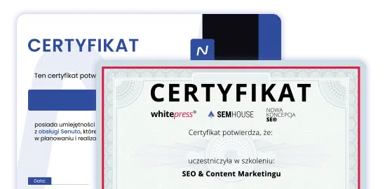 Każdy uczestnik na zakończenie szkolenia otrzyma imienny certyfikat SEO & Content Marketing SEM House & WhitePress oraz drugi dotyczący obsługi narzędzia SENUTO.